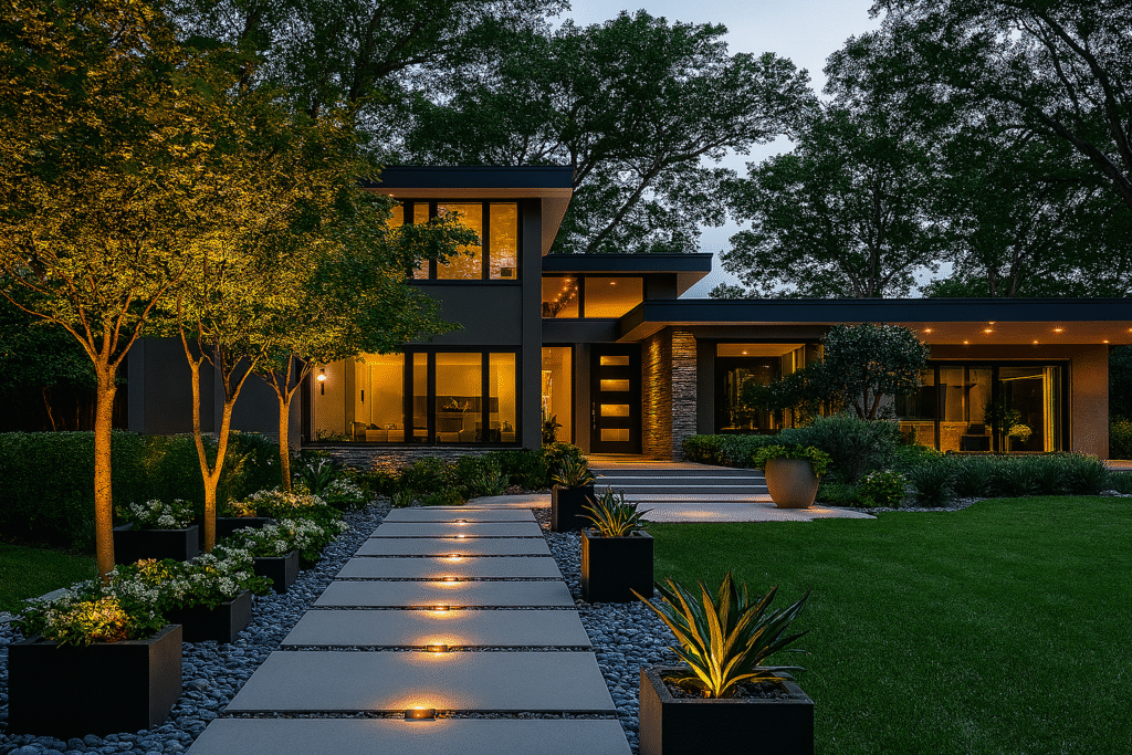 This contemporary front elevation combines sleek architectural lines with a warm, inviting nighttime glow. The façade features a mix of smooth surfaces and textured stone cladding, creating depth and visual interest. Expansive glass panels frame the living spaces, allowing interior lighting to enhance the exterior’s appeal after sunset. The pathway, crafted from large rectangular pavers bordered by smooth river stones, integrates recessed step lights that guide visitors toward the entrance. Symmetrical planters with structured greenery and accent uplighting add modern elegance, while the surrounding trees and manicured lawn soften the sharp geometry. This design captures the perfect balance between architectural sophistication and a welcoming atmosphere.
