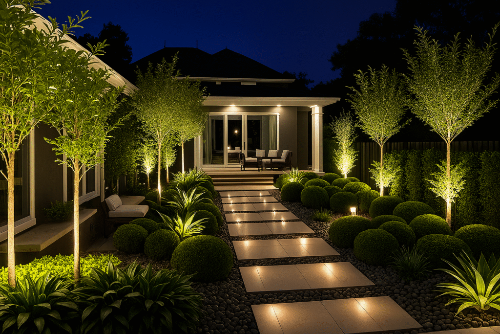 This front elevation radiates elegance through a perfectly orchestrated blend of landscape design and architectural lighting. A straight pathway of large, square tiles, framed by smooth river stones, leads the eye toward a cozy seating area under a covered porch. Each step is illuminated by recessed pathway lights, creating a welcoming glow. Manicured spherical shrubs and symmetrical rows of slender trees, highlighted by upward-facing spotlights, form a structured yet lush border. Low-level plantings with dramatic lighting add depth and texture, while the dark backdrop of the home enhances the warm illumination. This design offers a luxurious, resort-like ambiance that elevates curb appeal after dark.