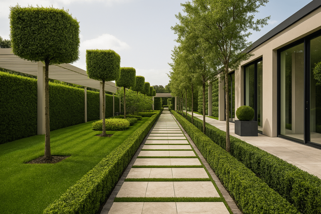This front elevation features a meticulously symmetrical pathway that creates a striking sense of order and precision. Large rectangular pavers are evenly spaced with strips of manicured grass, forming a rhythmic visual guide toward the entrance. On either side, perfectly trimmed boxwood hedges and a mix of square-topiary and slender upright trees create vertical balance. The left side incorporates a pergola structure, offering architectural depth and partial shade, while the right side aligns with sleek floor-to-ceiling windows that reflect the lush greenery. Every element, from the hedges to the pavers, is sharply defined, emphasizing a clean, geometric style that blends luxury landscaping with modern minimalism.