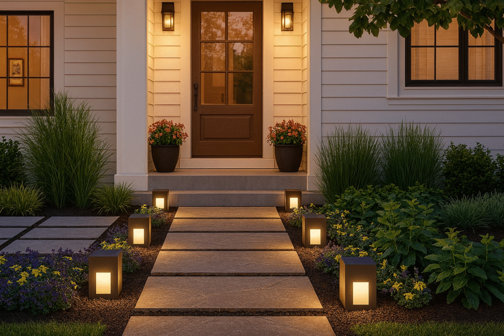 This front elevation exudes charm and warmth, combining classic cottage elements with modern lighting accents. The wooden front door, framed by white siding and symmetrical wall-mounted lanterns, creates a welcoming focal point. A straight pathway of wide stone slabs, bordered by cube lantern lights, guides guests to the entrance while casting a soft, ambient glow. Flanking the steps, black planters with blooming red-orange flowers add vibrant color, complemented by lush ornamental grasses and layered greenery on either side. The symmetrical landscaping, paired with the warm lighting, creates a cozy, inviting atmosphere that blends timeless style with a touch of contemporary elegance.