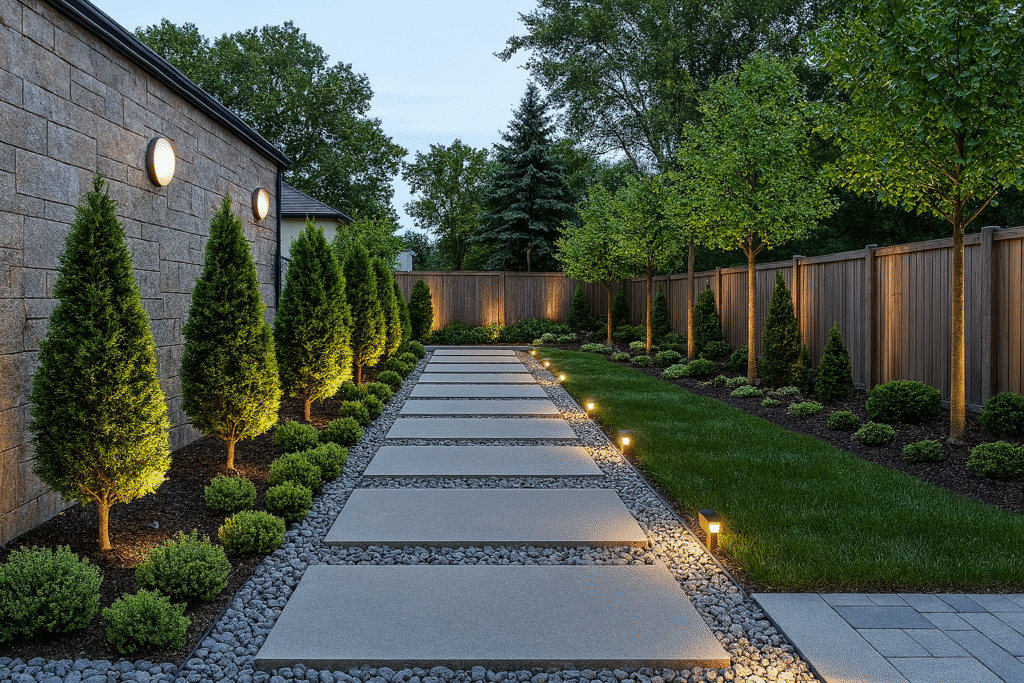 This garden pathway design combines structured symmetry with a warm, inviting ambiance. Large rectangular pavers are set in clean alignment, framed by smooth river stones that add texture and contrast. Ground-level lights run along both sides of the walkway, guiding the eye toward the distance while creating a soft evening glow. On one side, neatly pruned conical evergreens are underlit for dramatic effect, standing against a textured stone wall. On the opposite side, evenly spaced trees and manicured shrubs line the wooden fence, adding lush greenery and balance. The design blends modern landscaping with classic garden formality, creating a polished outdoor corridor perfect for both day and night appeal.